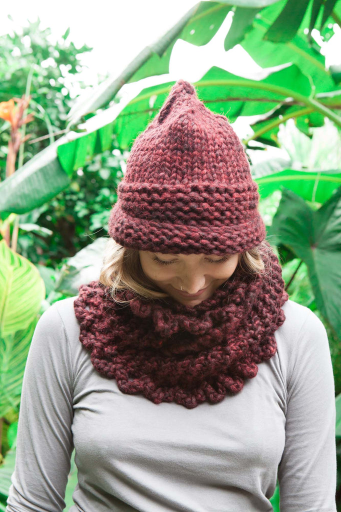 This is a gorgeous, squishy cowl and beanie that knits up easily and quickly. Knitted on straight needles and then seamed. The cowl can then be finished with the crochet stitch Solomon's knot if you wish. All you need is three balls of Cangiante yarn to knit both.